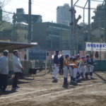 セレモニーは全員が1,2,3塁を囲うように並び、6年生は素振りをして1周、タッチをしてホームベースに戻り卒団を祝った。